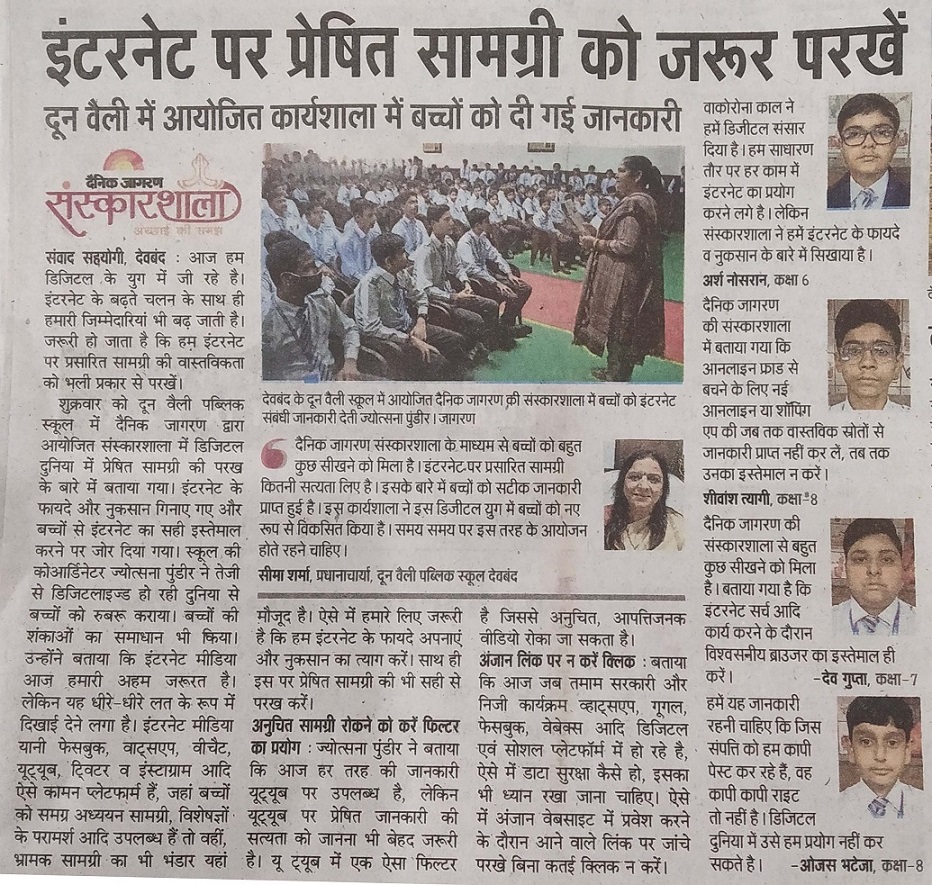 / News & Reflection / दैनिक जागरण की संस्कार शाला में इंटरनेट पर प्रेषित सामग्री को जरूर परखें की जानकारी दी गई