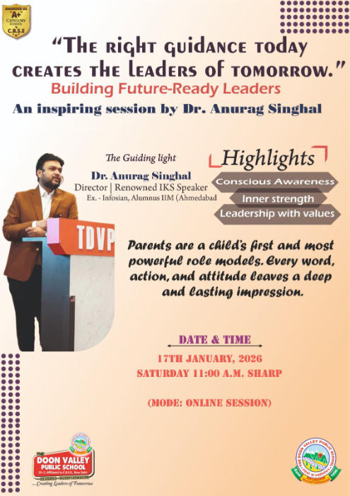Dear Parents and Students of Classes VII & VIII, Greetings of the day ✨ We are pleased to invite you to an online session with Dr. Anurag Singhal, an expert in Indian Knowledge Systems (IKS), focused on supporting students’ holistic development and overcoming learning and life challenges. Session Details: Date: 17 January 2026 (Tomorrow) Time: 11:00 a.m. Mode: Online Note: The session link will be shared at 9:00 a.m. Parents will also receive guidance on creating a positive and supportive home environment. We look forward to your active participation. Pre-Session Inputs: • Key challenges your child is facing • Support parents may need from the school • Topics you would like addressed Warm regards, Team Doon Valley